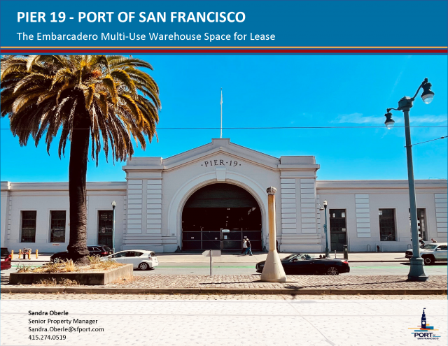 Pier 19 is located on The Embarcadero along the waterfront and a short walk from San Francisco’s financial, recreational, and cultural centers. The premises benefits from a high volume of pedestrian and vehicular traffic, a variety of retail and entertainment options, as well as a wide network of transit options, including San Francisco’s Ferry Terminal, the Transbay Terminal, BART and the I-80 East Freeway.
